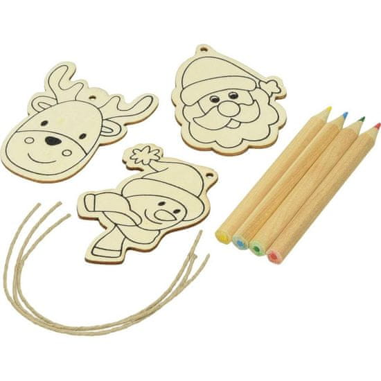 - sestavljen je iz 4 barvic, dolžine 7 cm, 3 lesenih novoletnih okraskov namenjenih za barvanje