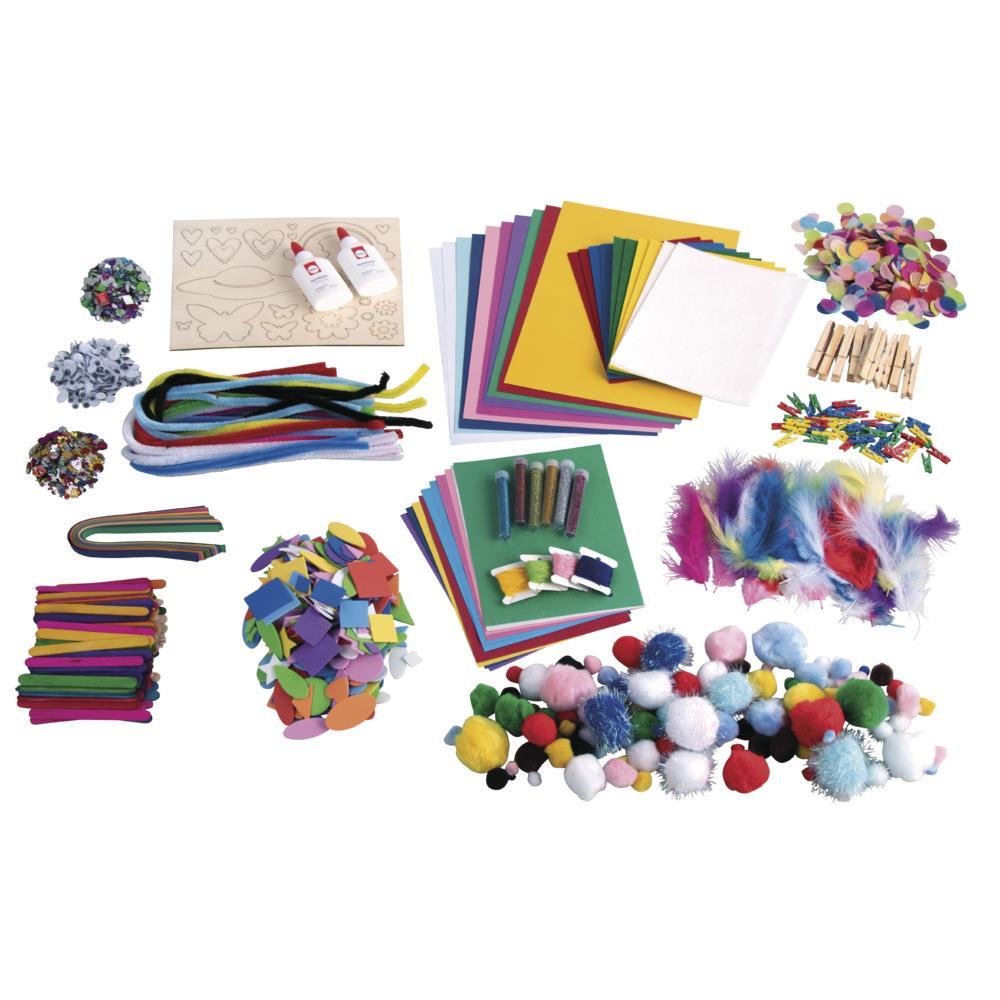 Vsebuje 2500 kosov različnih materialov za ustvarjanje – peresa, kosmate žičke, izreze iz penaste gume, pompone, plastične kristale, samolepilen filc, plastične oči, lesene palčke, bleščice ploščice, lepilo, lesene ščipalke, bleščice, penasto gumo, izreze iz lesa, vrvice, ter brošuro z ustvarjalnimi idejami.