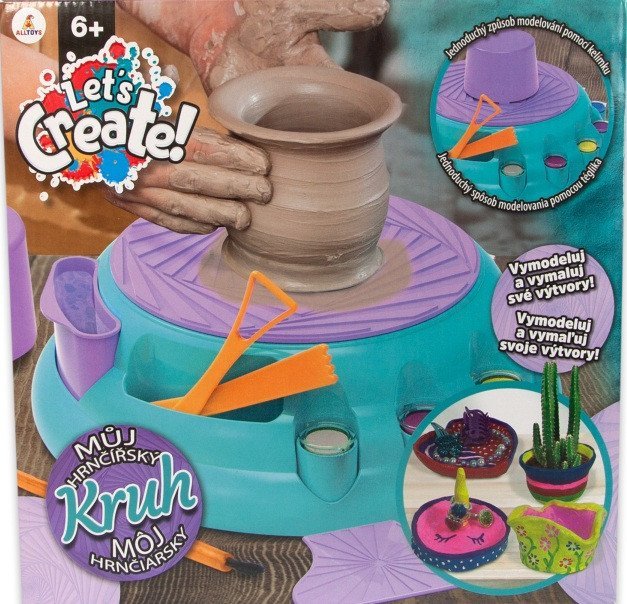 Krožek loterije za najmlajše. Zelo enostavno oblikovanje posod. Vključuje – lončarski krog, 2 orodji za oblikovanje, orodje za glajenje robov, predlogo za posodo, držalo za orodje, glino za sušenje na zraku, 6 različnih barv, čopič, priročnik.