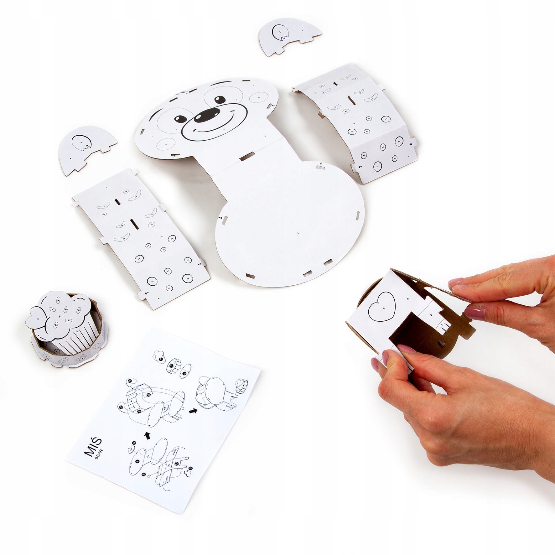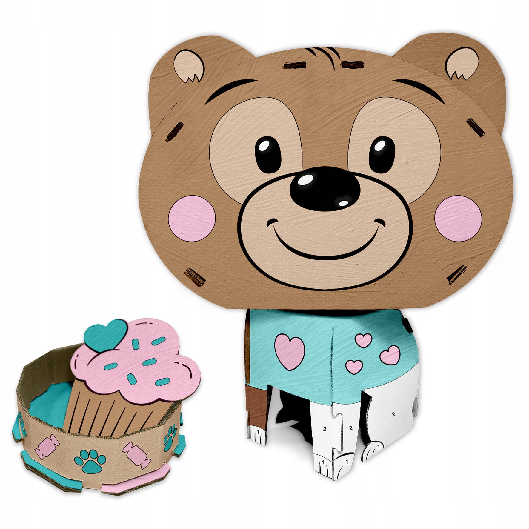 Komplet vsebuje figuro medvedka, njegovo skledo in kolaček, skupaj z navodili za sestavljanje, čopičem in 6 barvami.