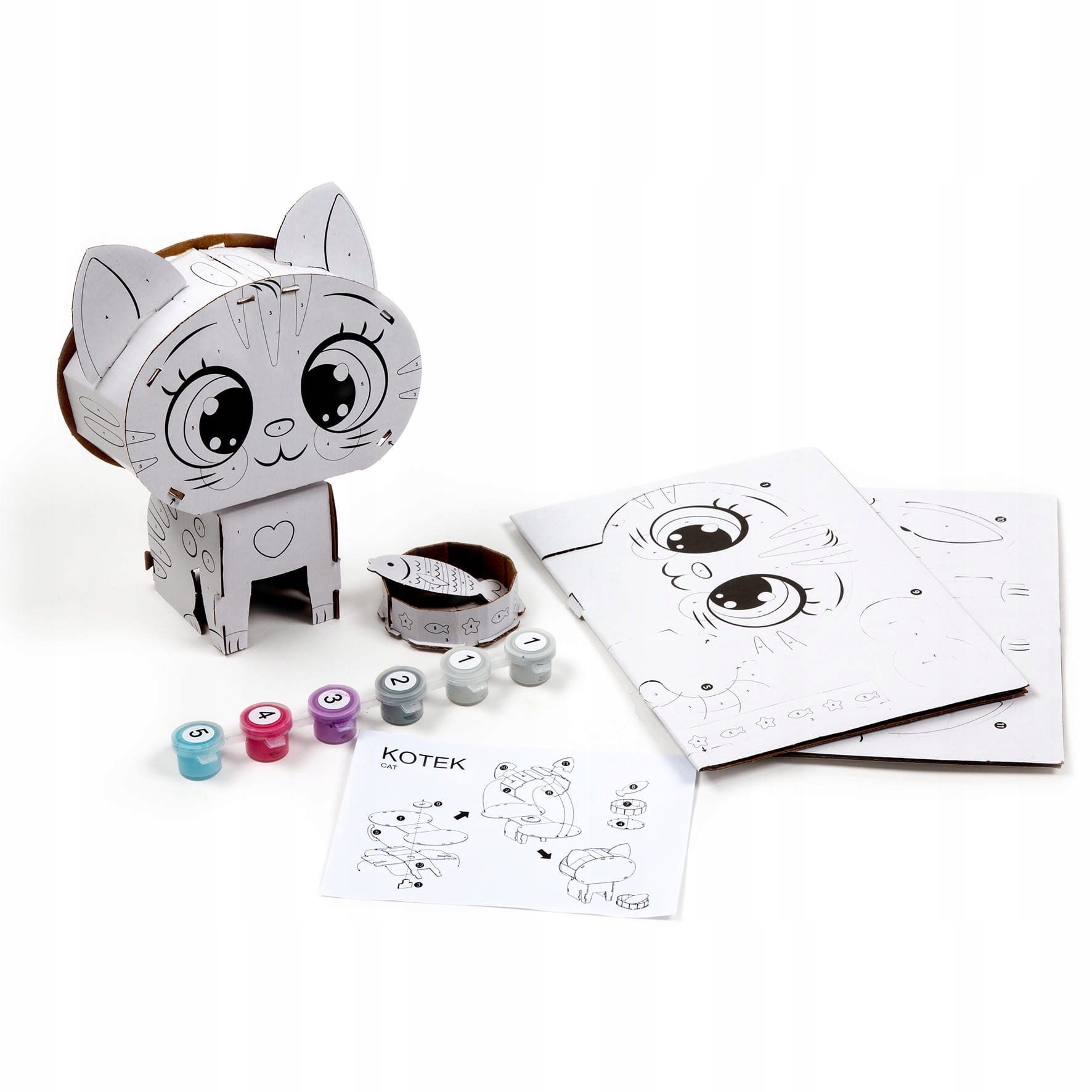 Komplet vsebuje figurico mucka, njeno skledo in ribico, skupaj z navodili za sestavljanje, čopičem in 6 barvami.