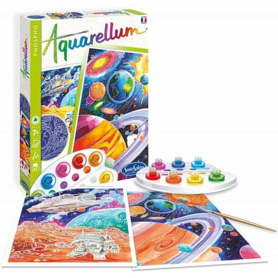 Ustvarjalni komplet z akvarelnimi črnili, ki se svetijo v temi, znamke Sentosphere. Domiseln in čudovito izdelan umetniški komplet iz serije Aquarellum znamke SentoSphere, ki nam bo omogočil ročno ustvarjanje barvitih slik z astronomskimi motivi. Končane slike imajo konturne elemente, ki v temi fosforescirajo. Akvarel je slikarska tehnika, ki vam omogoča, da sami naslikate popolne akvarelne slike. Elementi slik, ki so vključeni v komplet, so obdani z rahlo izbočenimi konturami, zaradi česar lahko vodite čopič, ne da bi šli čez obris elementa. Ko barvate naslednje dele slike, se pojavijo dekorativni mikromotivi. Dobljeni učinek daje vtis izjemne prefinjenosti, hkrati pa je dosežen brez večjih težav. Te zmogljivosti vam omogočajo, da pustite prosto pot svoji barvni domišljiji. Akvarelne komplete odlikuje skrbnost in visoka kakovost izdelave. Uporabljajo specializiran pergamentni papir, debel in visokokakovosten, idealen za skrbno slikanje z akvarelnimi barvami. Imajo posebej pripravljene ilustracije, na katerih se z vsakim potegom čopiča pojavijo novi motivi, barva pa se prime le tam, kjer bi morala. Vsi elementi v kompletu so izbrani v skladu s standardi trajnostnega razvoja: Stekleničke so izdelane iz recikliranega PET in so 100 % reciklirne. Nestrupena črnila na vodni osnovi. Paleta je 70 % izdelana iz recikliranega materiala in je 100 % reciklirna. Kartonska embalaža je 100 % izdelana iz recikliranih materialov. Papir s certifikatom FSC. Vsebina kompleta: 2 pripravljeni sliki 32,5 × 25 cm. 1 zelo kakovosten čopič za akvarel. 1 paleta za ustvarjanje barvnih palet. 7 stekleničk s pralnim in nestrupenim črnilom. 1 pipeta za doziranje črnila. 1 navodila za uporabo. Proizvajalec: Sentosphere, Francija. Starost: 7+ let. Dimenzije škatle: 34 × 26 × 3 cm. Varnost: certifikat CE, FSC, ASTM D4236.