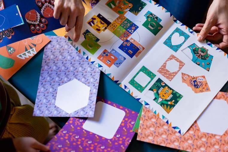 Komplet vsebuje 6 listov vzorčastega papirja – ena stran s prostorom za podpis ali naslavljanje voščilnice, druga za postavitev živali, 6 listov z vnaprej izrezanimi elementi za odstranjevanje in zlaganje ter list z neonskimi nalepkami – detajli okrasnih bitij