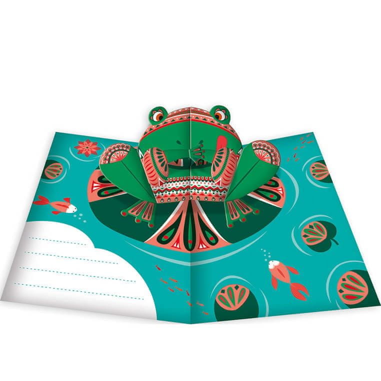 Komplet Prostorske 3D pojavne kartice francoske blagovne znamke JANOD vam bo omogočil, da ustvarite skupno 6 originalnih, odpiralnih kartic s 3D elementi , vključno z žabo, lisico ali pavom
