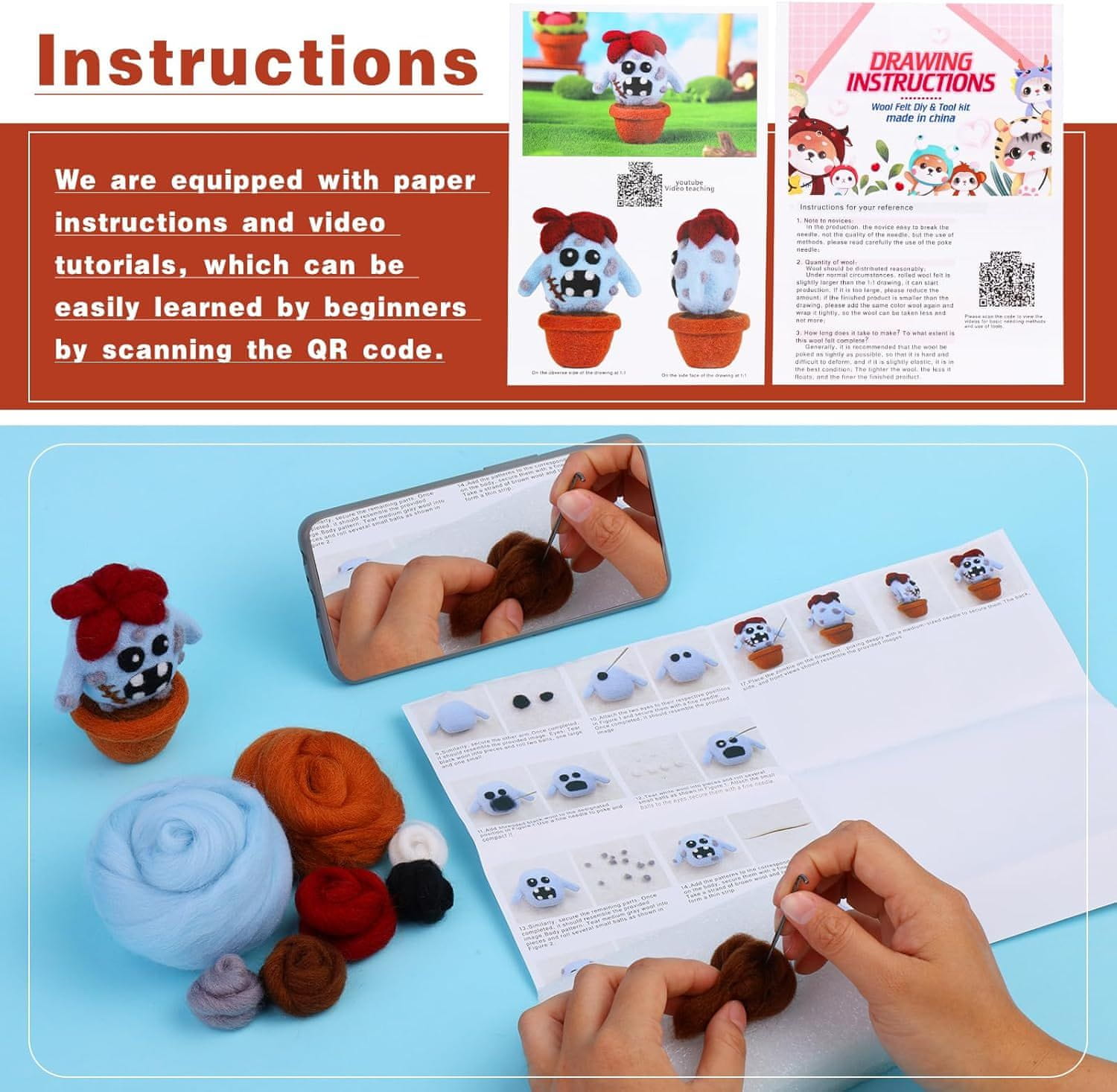 •     Začetnikom prijazno: Naš komplet volnenega filca za začetnike vključuje podrobna navodila po korakih, ki jih je enostavno razumeti. Sledite navodilom po korakih v priročniku (ni na voljo v angleščini), da ustvarite čudovite punčke iz filca, ne da bi vas skrbelo, da bi naredili napako.