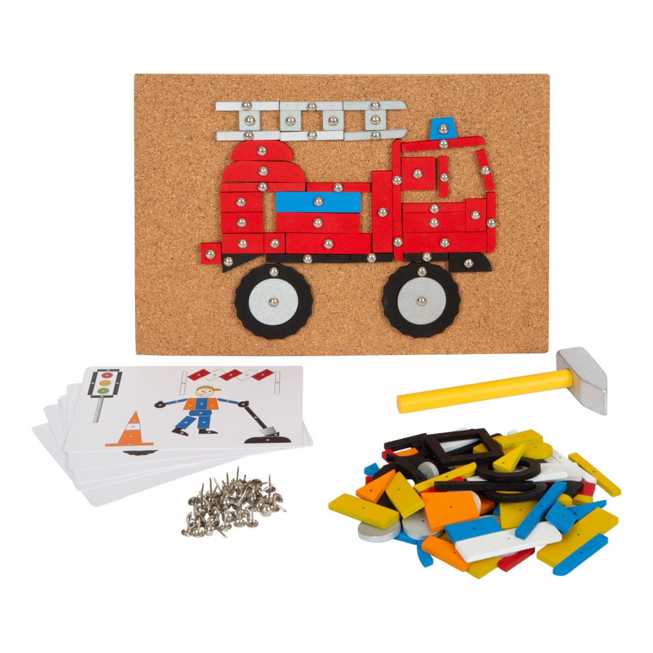 Vseobsegajoč ustvarjalni igralni set s prometno tematiko! V paketu boste našli plutovinasto podlogo, leseno kladivo, palčke in številne laminirane lesene koščke različnih oblik in barv. V škatli, ki je primerna tudi za shranjevanje te igrače, boste našli šest slikovnih predloh.Klasickigro s kladivom v sodobnih barvah in nesmrtnem dizajnu, s katero lahko otroci ustvarijo slike prevoznih sredstev, gradbenih strojev itd. Pri tem lahko sledijo predlogam slik ali pa ustvarjajo v skladu s svojo domišljijo. Igrača pomaga pri razvoju ustvarjalnosti, trenira spretnost, izboljšuje koordinacijo rok in oči ter prepoznavanje barv in oblik. Komplet za zabijanje je primeren za majhne in velike otroke. Glavne značilnosti: igra za zabijanje z bogatim izborom motivov leseno kladivo, palčki, plutovinaste blazinice različnih oblik in barvdeti bodo vadili motorične sposobnosti ter prepoznavanje oblik in barvsodobne barvne shemeizboljšuje spretnost in koordinacijo roka-oko