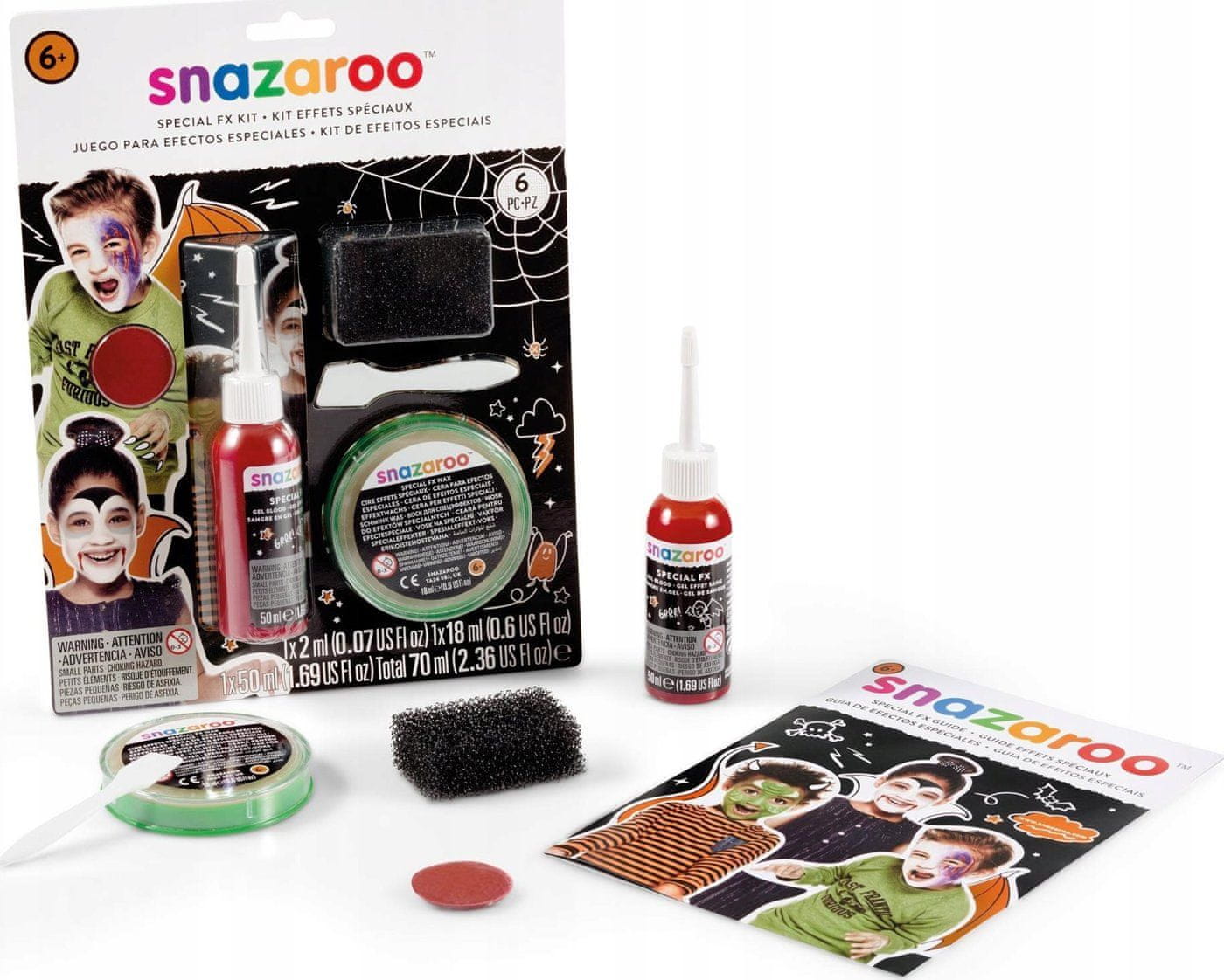 pripomoček za poslikavo obraza, idealen za noč čarovnic, kurjenje čarovnic ali zabave FX vosek 18 ml za ustvarjanje lažnih ran, bradavic, čarovniških nosov FX lažna kri 50 m l za prepričljiv videz ran bordo rdeče barve Snazaroo 2 ml za ustvarjanje modric in odrgnin drugi dodatki: lopatka za nanašanje voska, gobica za posebne učinke, slikovna navodila varen in nestrupen , primeren tudi za občutljivo kožo enostavno odstranljiv – umivati z milom in vodo