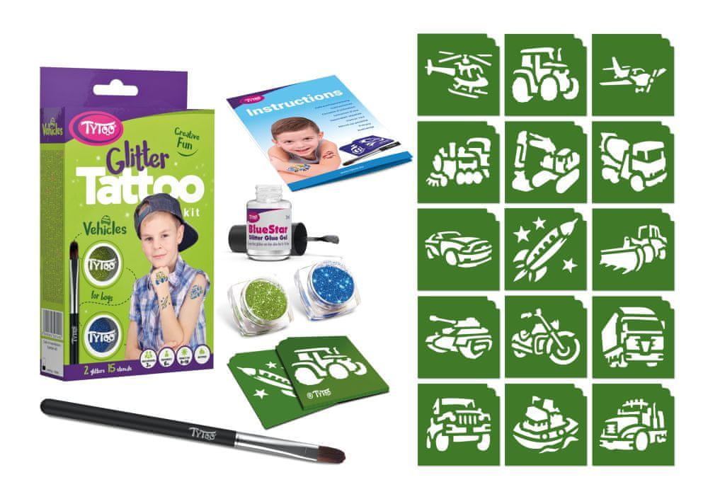Različne vrste vozil. Vzorci: 15 kosov. Barva: 2 kosa. Vzorec na usnju običajno zdrži 8–18 dni. Dolžina tega časa je v veliki meri odvisna od vrste kože in stopnje previdnosti, s katero pristopate k tetoviranju. Tetovaže z bleščicami so odporne na vodo, vendar jih je mogoče enostavno odstraniti z alkoholom ali otroškim oljem. Večji kompleti vsebujejo več orodij. Na samolepilne kamenčke nanesite majhno količino lepila in jih pritisnite na kožo. Lepilo nanesite na lepilno palčko in nanesite majhno količino lepila na lepilno palčko.