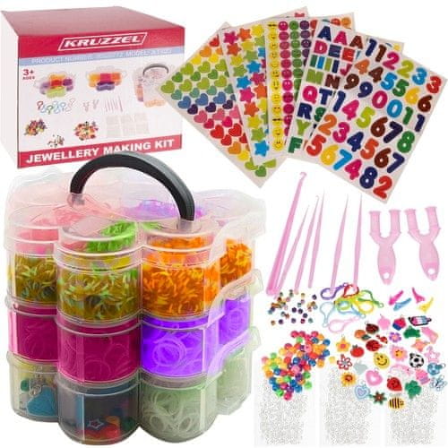 • VELIKI SET – komplet vsebuje vse potrebne elemente za ustvarjanje zapestnic ali drugih pripomočkov iz gumic. Paket vključuje gumice , kvačke, frače, okrasne elemente in obeske.