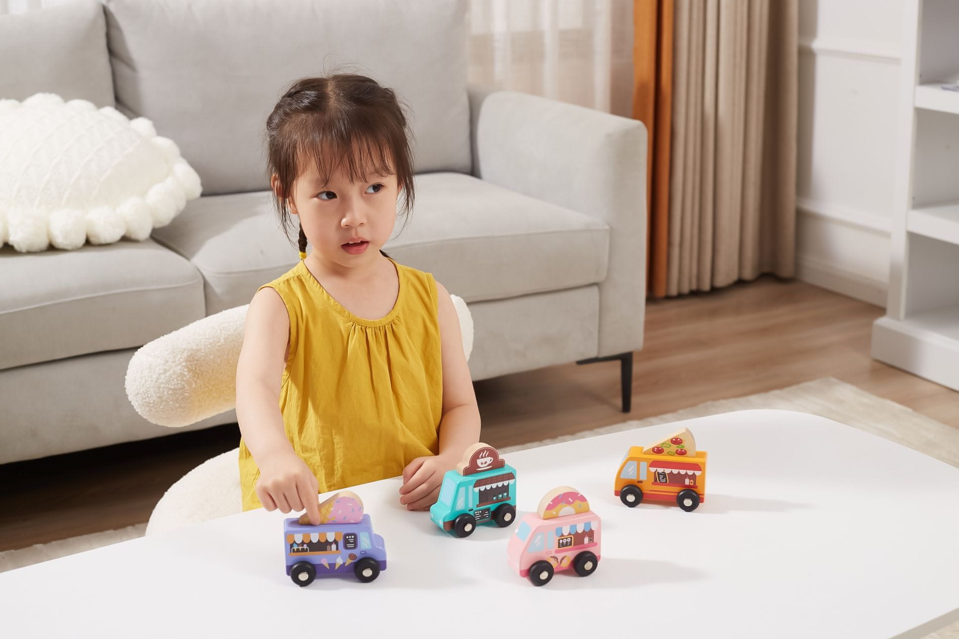 Ta komplet vozil znamke Viga je ena najbolj čudovitih igrač, ki bo vašemu otroku prinesla veliko zanimivega in ustvarjalnega zabava. Štiri vozila za prevoz hrane lahko opremite s strešnim elementom s sliko, primerno za kavarno, slaščičarno, slaščičarno ali picerijo.