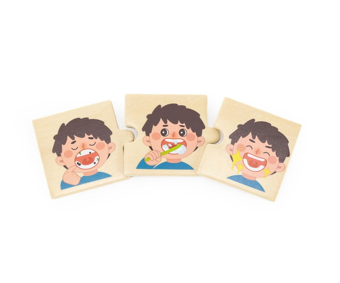 To je odlična igračka za otroke, ki jim omogoča, da se učijo in utrjujejo svoje znanje pri prepoznavanju in opisovanju dane dejavnosti, npr. Kako si umivamo zobe? Kako v zimskem času gradimo snežaka? Kako in zakaj si umivamo roke? Zakaj zalivamo rože? Kakšno torto pripravimo za rojstni dan? S tem kompletom sestavljank imamo veliko priložnosti za razvoj odnosa z otrokom.