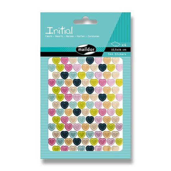 Samolepilne nalepke Maildor Initial Metallic manjše velikosti z motivom srčkov s kovinskim učinkom. Paket vsebuje 4 liste, 2 motiva po 2 kosa. Dimenzije paketa: 10,5 × 16 cm.