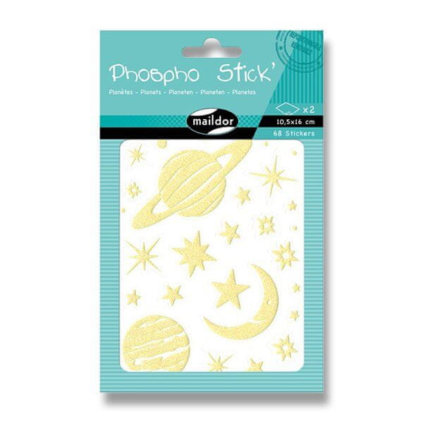 Maildor Initial Phospho nalepke z motivi planetov v bleščečem in fosforescentnem dizajnu. Paket vsebuje 2 lista, 2 motiva po 1 kos. Nalepke je mogoče odlepiti in jih ponovno nalepiti. Dimenzije paketa: 10,5 × 16 cm.
