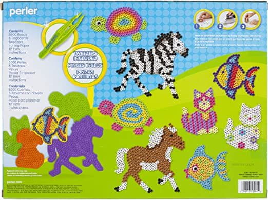 – Komplet vključuje (5000) izbranih kroglic Perler, (5) desk Perler, (1) pinceto Perler in zajemalko, (12) premikajočih se oči in (1) list papirja za večkratno uporabo za likanje