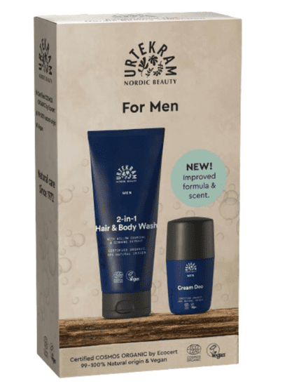 Urtekram For Men, darilni set za moške, BIO Sveža, naravna in učinkovita nega za moške – ta darilni set za moške vključuje gel za umivanje las in telesa ter deodorant, ki se odlično dopolnjujeta in zagotavljata celovito dnevno nego. Set je idealno darilo za vsakega moškega, ki ceni naravne sestavine in učinkovite formule, ki negujejo kožo in lase. Vsebina darilnega kompleta: Gel za umivanje telesa in las z izvlečkom ginsenga in bio vrbovim ogljem – ta gel za umivanje je obogaten z ginsengom, ki kožo osveži, in vrbovim ogljem, ki deluje razstrupljevalno. Gel ima sivo-črn odtenek, ki je posledica prisotnosti vrbovega oglja, a brez skrbi, ne obarva kože in las. Sestava je nežna in primerna za vse tipe kože in las. Dezodorant z učinkovito kombinacijo cinkovih soli,