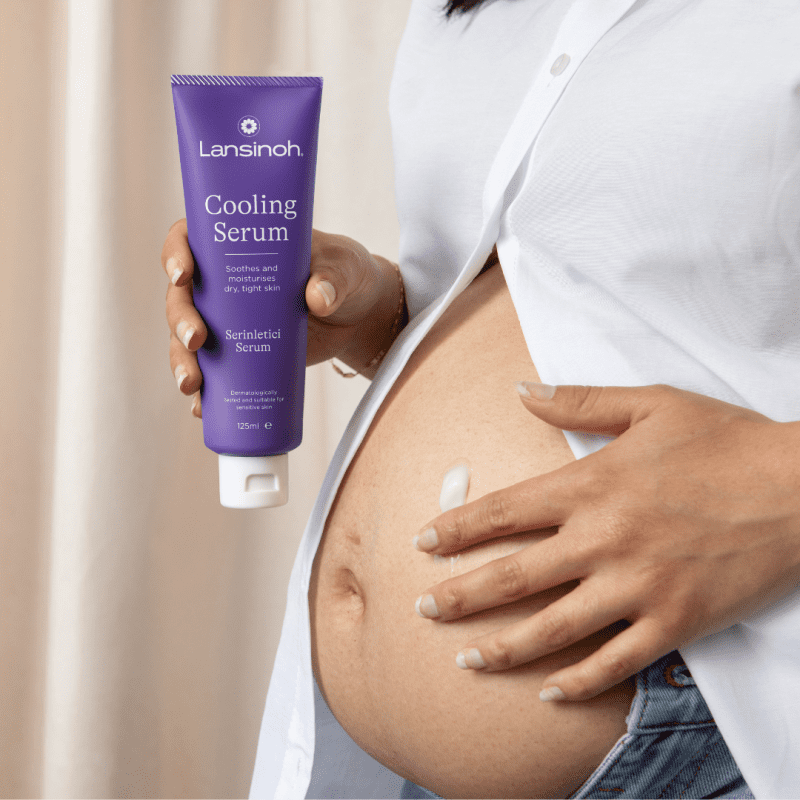 Hladilni serum za nosečniški trebuh. Pomirja in vlaži suho, napeto in srbečo kožo.