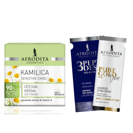 Afrodita Camomile Eye Cream + 2 vzorca. Linija Camomile Sensitive Care za občutljivo kožo pomirja in neguje razdraženo kožo. Ščiti pred prostimi radikali, spodbuja regeneracijo celic, kožo oskrbuje z vlago in hranili, ustvarja zaščitno lipidno plast na površini kože ter krepi strukturo kože. Lastnosti: Pomaga zmanjšati podočnjake in zabuhlost. Zelo občutljivo. Brez parabenov, parafina in silikona. Dermatološko testirano. Hipoalergena dišava. Koži prijazna formula pomaga obnoviti raven vlage v različnih plasteh kože okoli oči in ščiti pred izsušitvijo. Odlična kombinacija kamilice in dragocenega bisabolola nežno pomirja razdraženo in utrujeno kožo, medtem ko ceramidi učinkovito delujejo proti staranju in proti gubam. Tekstura kože je okrepljena, gube so zglajene, temni kolobarji in zabuhlost pod očmi pa občutno zmanjšani. Fotografija dveh vzorcev je naključna, naročilo bo vsebovalo naključne vzorce blagovne znamke Afrodita in če bodo vzorci razprodani, bomo k naročilu dodali brezplačne artikle Afrodite, kot so zvezek, pisalo, torbice ali drugi pripomočki proizvajalca.