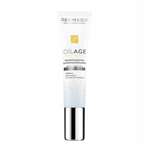 Koncentrirana krema za oči Oilage 15 ml. Sodobna oljna formula. Zagotavlja takojšnjo revitalizacijo kože okoli oči. Zmanjšuje zabuhlost in temne kolobarje. Zgladi tudi globoke gube. Vidno pomlajuje in regenerira kožo. Upočasnjuje staranje kože v perimenopavzi. Zahvaljujoč formuli proti onesnaženju spodbuja obrambne funkcije povrhnjice in ščiti pred negativnimi učinki okoljskih dejavnikov, vključno z onesnaženjem in lebdečim prahom. Nekomedogena. Za kateri tip kože? Priporočljivo za nego občutljive kože okoli oči z vidnimi znaki staranja (mimične gube, gravitacijske gube, strukturne gube) in nagnjenostjo k temnim kolobarjem in zabuhlosti. Navodila za uporabo: Na očiščeno kožo okoli oči nanesite majhno količino pripravka, nežno vtapkajte in pustite, da se vpije. Aktivne sestavine: TriOleum Complex, Hesperidin, Fitoskvalan, Vitamin E, Alantoin, Betain, Glicerin