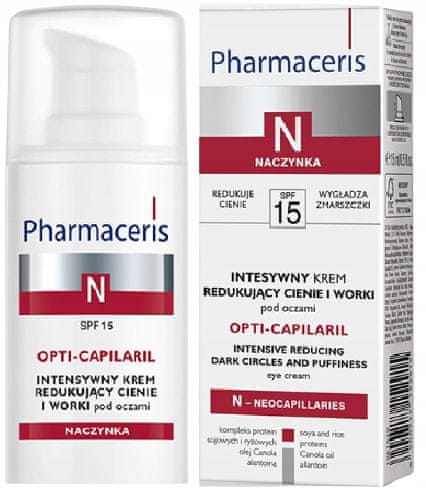 PHARMACERIS N OPTI-CAPILARIL krema za oči proti temnim kolobarjem in podočnjakom 15 ml Ta krema je priporočljiva za vsakodnevno nego zrele kože okoli oči, za katero so značilni vidni temni kolobarji in zabuhlost. Kompleks sojinih in riževih beljakovin v kremi znatno zmanjša temne kolobarje in podočnjake. Študije so pokazale zmanjšanje podočnjakov pri 64 %* preiskovancev in zmanjšanje temnih kolobarjev pod očmi pri 60 %* preiskovancev. Vitamin E, naravno sredstvo proti radikalom, preprečuje prezgodnje staranje kože. Zahvaljujoč filtrom kreme zmanjšuje škodljive učinke UVA in UVB sevanja, kar je še posebej pomembno za kožo pod očmi, ki je veliko tanjša kot na drugih predelih obraza. Krema ima pomirjujoč in sproščujoč učinek. SESTAVINE: Kompleks sojinih in riževih beljakovin znatno zmanjša temne kolobarje in podočnjake ter tako preprečuje znake staranja kože. Zagotavlja dolgotrajno hidratacijo in nego. Olje kanole, bogato z naravnim vitaminom E, ima pomirjujoče in protivnetne lastnosti. Zmanjšuje simptome suhosti povrhnjice. Alantoin, ki deluje na pomirjanje draženja, pomirja in regenerira povrhnjico. NAVODILA ZA UPORABO: Kožo pripravite na nanos kreme tako, da jo očistite z izdelkom iz linije Pharmaceris N. Nato kremo nanesite okoli oči in pazite, da ne pride v veznico. Uporabljajte vsak dan vsaj 4 tedne. VARNOST IN UČINKOVITOST: Dermatološka formula, razvita za občutljivo kožo. Visoka toleranca in učinkovitost. Dermatološko testirano. Učinkovitost potrjena v dermatoloških testih na koži z razširjenimi kapilarami*: 92 % zgladi, 76 % posvetli kožo pod očmi, 88 % navlaži, 92 % povrne udobje, 76 % pomiri in umiri. Vir: *testi in vivo v Centru za znanost in raziskave dr. Irene Eris po 4 tednih uporabe. Sestavine/Ingrediente: Voda (Aqua), C12–15 alkil benzoat, etilheksil metoksicinamat, butilen glikol, poligliceril-3 metilglukozni distearat, butil metoksidibenzoilmetan, pentilen glikol, natrijev poliakrilat, glicerin, PEG-8, olje kanole (Canola), izvleček cvetov kovačnika (Lonicera Caprifolium), alantoin, kopolimer natrijevega akrilata/natrijevega akriloildimetil taurata, hidrolizirane beljakovine riževih otrobov, izvleček cvetov japonskega kovačnika (Lonicera Japonica), tokoferol, izoheksadekan, dinatrijev EDTA, polisorbat 80, askorbil palmitat, sorbitan oleat, beljakovine soje (Glycine Soja), superoksid dismutaza, askorbinska kislina, citronska kislina, natrijev dekstran sulfat, fenoksietanol, natrijev benzoat, kalijev sorbat, sljuda, CI 77891 (titanov dioksid)