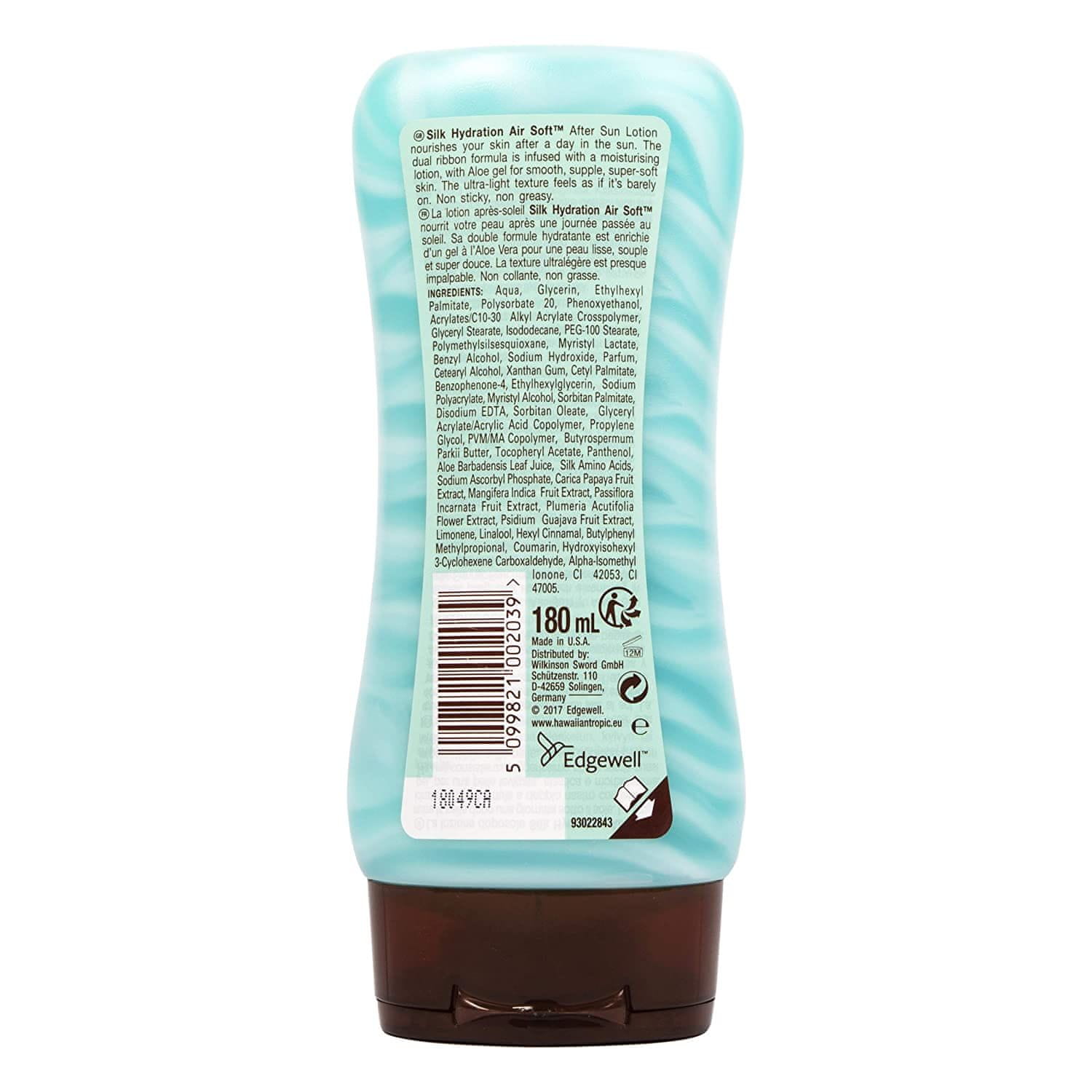 Hawaiian Tropic Silk Hydration ultra-lahek losjon nahrani vašo kožo po dnevu na soncu z lahko formulo, ki daje občutek, kot da bi jo komaj morali nanesti! Ta edinstvena vlažilna formula z dvojnim trakom z vlažilnim losjonom, karitejevim maslom in aloe vero zagotavlja 24-urno vlaženje, kožo naredi gladko, voljno in izjemno mehko, hkrati pa pomaga ohranjati vašo porjavelost. Ta losjon za po sončenju je nelepljiv in nemasten ter zagotavlja rahlo vlaženje. Hawaiian Tropic Silk Hydration Lotion je oblikovan z otoškimi rastlinami in sestavinami, kot so aloja, papaja, mango, pasijonka, plumerija in guava, za nego kože, ki ji lahko zaupate. Poleg nege vaše kože Hawaiian Tropic pomaga tudi pri negi planeta z ustvarjanjem grebenom prijaznih izdelkov za sončenje brez krutosti.