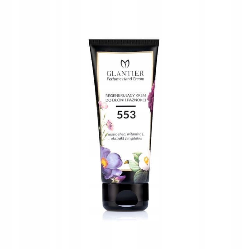 Glantier 553 regeneracijska krema za roke in nohte 75 ml Ženstvena eleganca in čutnost v mamljivi orientalsko-cvetlični različici. Ta drzna in prefinjena dišava nikogar ne bo pustila ravnodušnega. Je lahka in intenzivna, poudarja močan značaj in pritegne pozornost – kot glasno klikanje visoke pete. Prve note, ki očarajo, so poživljajoča nota kave in grenkega mandlja. Sledi cvetlično srce nežnega jasmina in eterične tuberoze. V osnovi plemenite osnovne note tvorijo nežni toni tonke fižola, balzamične sandalovine, sladke vanilije in aromatičnega kakava. Regeneracijska krema za roke 553: Globinsko hranljiva, odišavljena krema za roke in nohte, ki odlično navlaži in regenerira suho in dehidrirano kožo. Zahvaljujoč svoji koncentrirani formuli pomirja nelagodje, povezano s hrapavostjo, krepi in gladi roke ter zagotavlja občutek olajšanja in prehrane. Vsebuje kar 86% sestavin naravnega izvora! Krema za roke 553, ustvarjena z mislijo na najzahtevnejšo kožo rok, je sestava skrbno izbranih hranil, ki vlažijo, negujejo in regenerirajo. Karitejevo maslo je bogato z nenasičenimi maščobnimi kislinami, vitamini A, E in F ter minerali, kot so magnezij, cink in kalij. Zaradi tega je idealen za preprečevanje izsušenosti, upočasnjuje staranje kože in podpira regeneracijo kože, hkrati pa ščiti pred škodljivimi zunanjimi dejavniki. Alantoin ima predvsem močne vlažilne, regenerativne, protivnetne, pomirjevalne in adstrigentne lastnosti. Prinaša olajšanje suhi koži, jo naredi mehkejšo in bolj gladko na dotik. Učinkovito se bori proti mikropoškodbam in podpira celjenje razdražene kože. Izvleček mandljev zaradi nenasičenih maščobnih kislin v trenutku navlaži in izboljša elastičnost kože. „Vitamin mladosti“, ki ga vsebuje izvleček, krepi krhke nohte in jih znatno nahrani ter jih naredi trde, močne in odporne na zunanje dejavnike. Moč dišave 553 je shranjena v priročni posodici. Prostornina: 75 ml