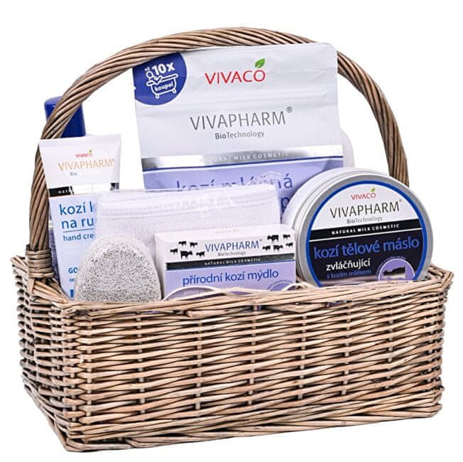 Krasen darilni paket kozmetike s kozjim mlekom za nego telesa in obraza v pleteni darilni košari. Kozmetika s kozjim mlekom je vrnitev k naravi in naravnim virom. Vsebuje veliko količino mineralov, elementov v sledovih, vitaminov in folne kisline. Blagodejno vpliva na kožo, saj jo neguje, mehča in mehča, zagotavlja uravnotežen pH in zadostno vlaženje. Kožo naredi mehko in gladko. Zelo pozitivno vpliva na občutljivo in problematično kožo ter je primeren tudi za alergike, psoriatike in atopike. Darilni paket vsebuje: