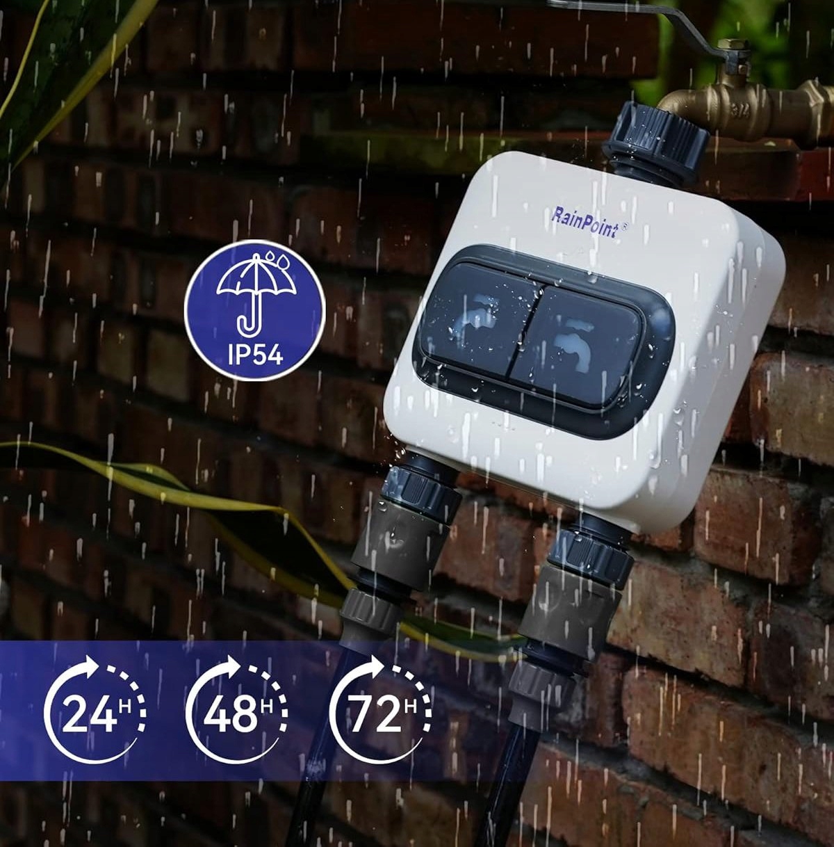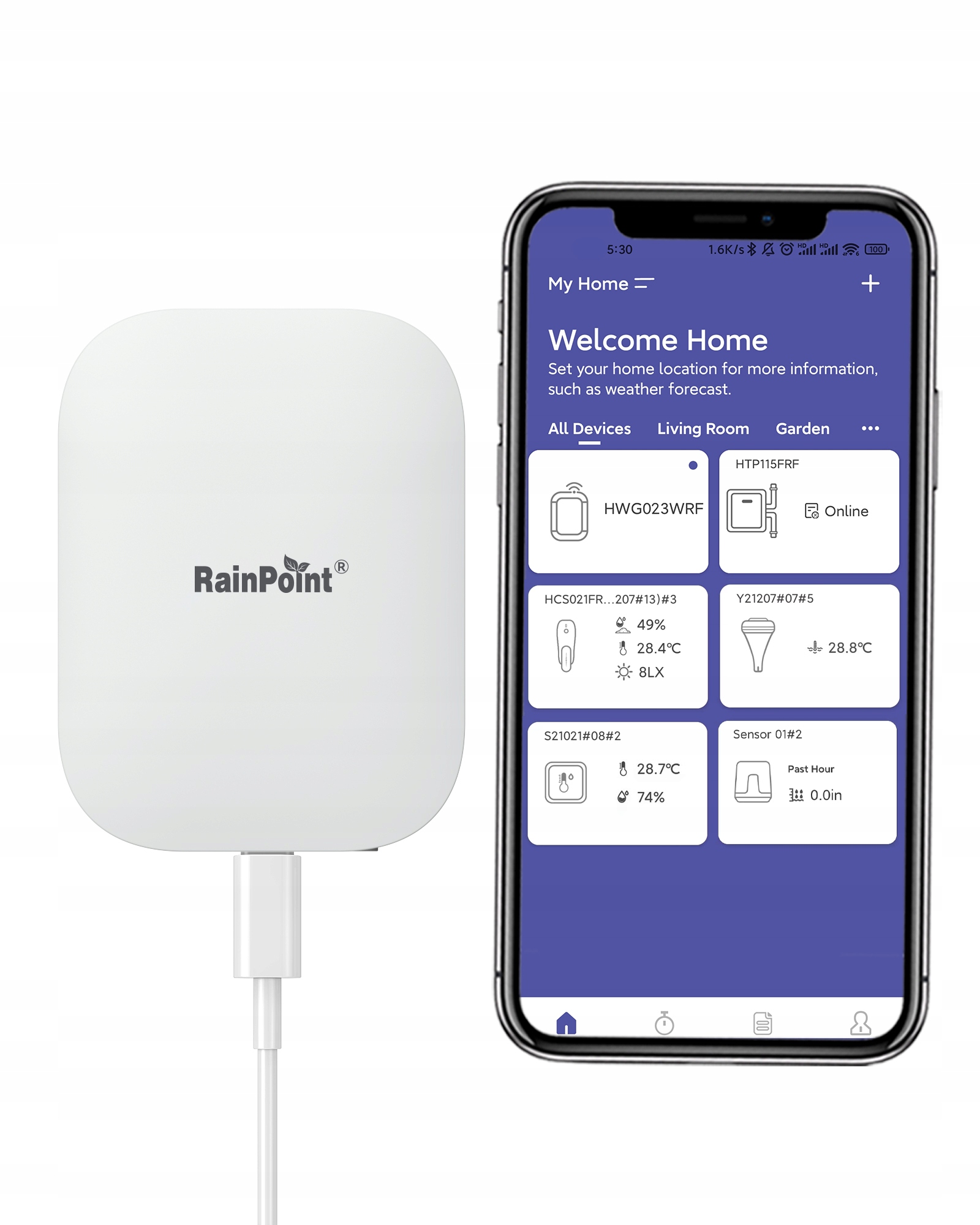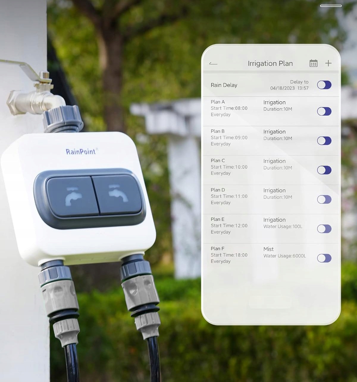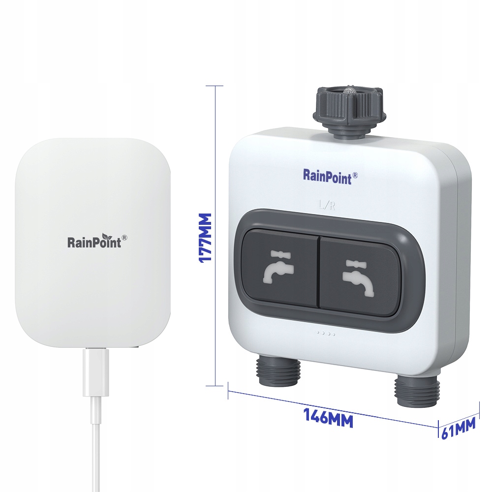RainPoint Smart+ je pametni namakalni sistem, ki združuje krmilnik namakanja, vodomer, senzor tal in sončne svetlobe, dežemer in zunanji termometer. Z RainPoint Smart+ lahko avtomatizirate celoten namakalni sistem in pridobite natančne vremenske informacije tako v aplikaciji kot prek vremenske postaje.