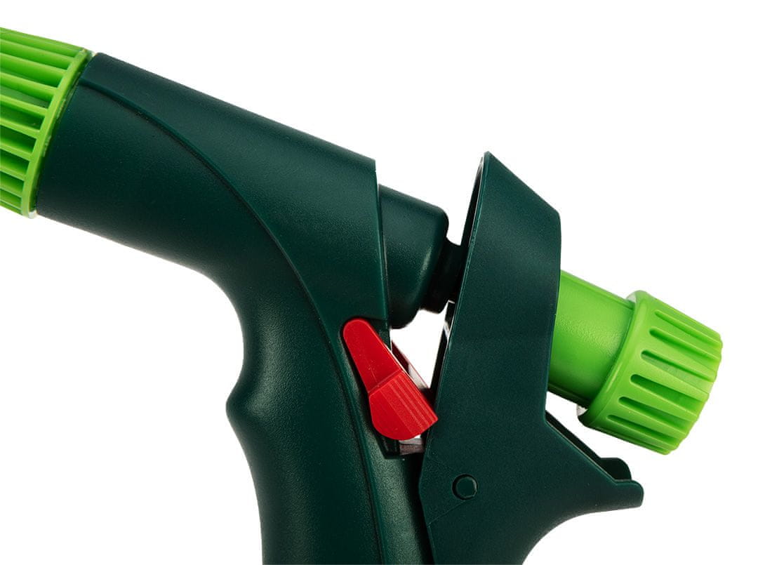 Nastavljiva brizgalna pištola VERTO 15G716 ima gumb za nastavitev vodnega curka od fine meglice do močnega curka. Pištola ima tudi zadnjo ročico za zaklepanje, ki omogoča neprekinjeno delovanje. Ergonomsko oblikovan ročaj se udobno prilega roki in je nedrseč, kar izboljša udobje. Izdelan je iz trpežne ABS plastike.