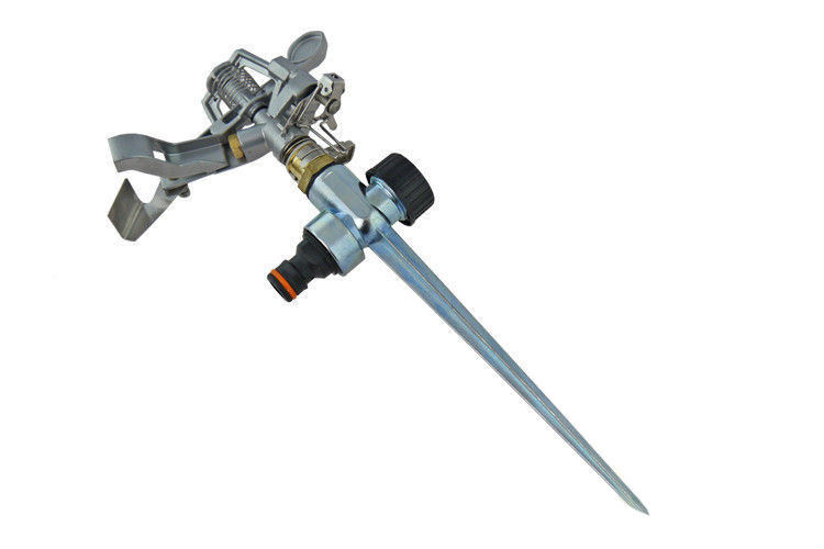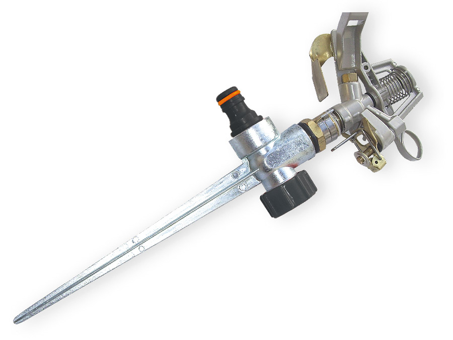 • Kovinski pulzirajoči zalivalnik Bradas ECO-KT230B, pritrjen na konico. Nastavljiva velikost in oblika škropilnega polja. Zaklepanje za škropljenje izbranega sektorja. Konica ima hitro spojno cev in možnost zaporedne povezave z drugimi zalivalniki. Površina škropljenja 27 m.