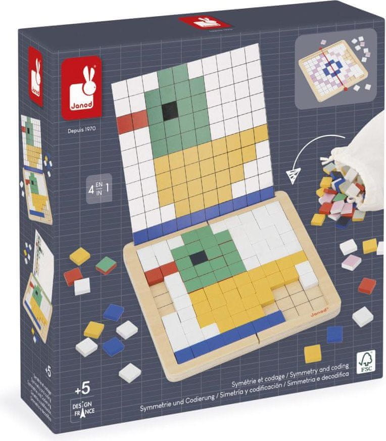 Odkrivajte zabavno in poučno kodirno igro Pozor, žaba!, ki ponuja 4 različne načine igre, s katerimi se otroci učijo osnov logike, razvijajo koncentracijo in prostorsko domišljijo: Kopiranje – otroci barvne ploščice postavijo neposredno na vzorec. Reprodukcija – Otroci postavijo vzorec ploščic poleg vzorca. Simetrija – Naloga je dopolniti manjkajočo polovico slike tako, da se zrcalno ujema z vzorcem. Šifriranje – uporaba barvnih in številčnih kod na kartici za razkritje skrite slike. Ta lesena izobraževalna igra spodbuja ustvarjalno razmišljanje, razvoj matematičnih spretnosti in sposobnosti reševanja problemov. Idealna za samostojno igro ali igro v paru. Izdelana je iz visokokakovostnega lesa in kartona s certifikatom FSC.