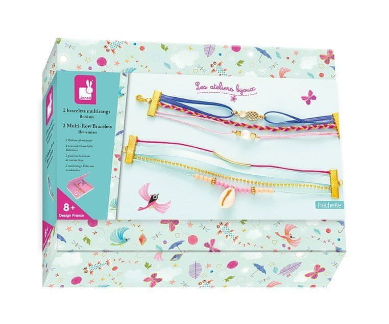 Ustvarjalni komplet Moja škatla za nakit Boho zapestnice francoske znamke JANOD vam bodo omogočile, da ustvarite skupno 2 kosa unikatnih, večpramenskih zapestnic Komplet vključuje pisane trakove, vrvice, perlice, školjko, majhne kovinske elemente zlate barve in zaponke za obe zapestnici V samo nekaj trenutkih lahko vaš otrok postane ustvarjalni zlatar! Rezultati bodo zagotovo impresivni Ta nakit bo dopolnil številne izvirne sloge in je tudi odlična ideja za darilo za najboljšo prijateljico ali mamo