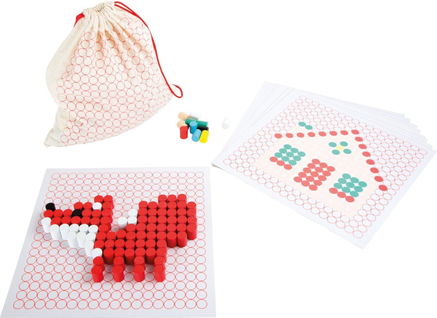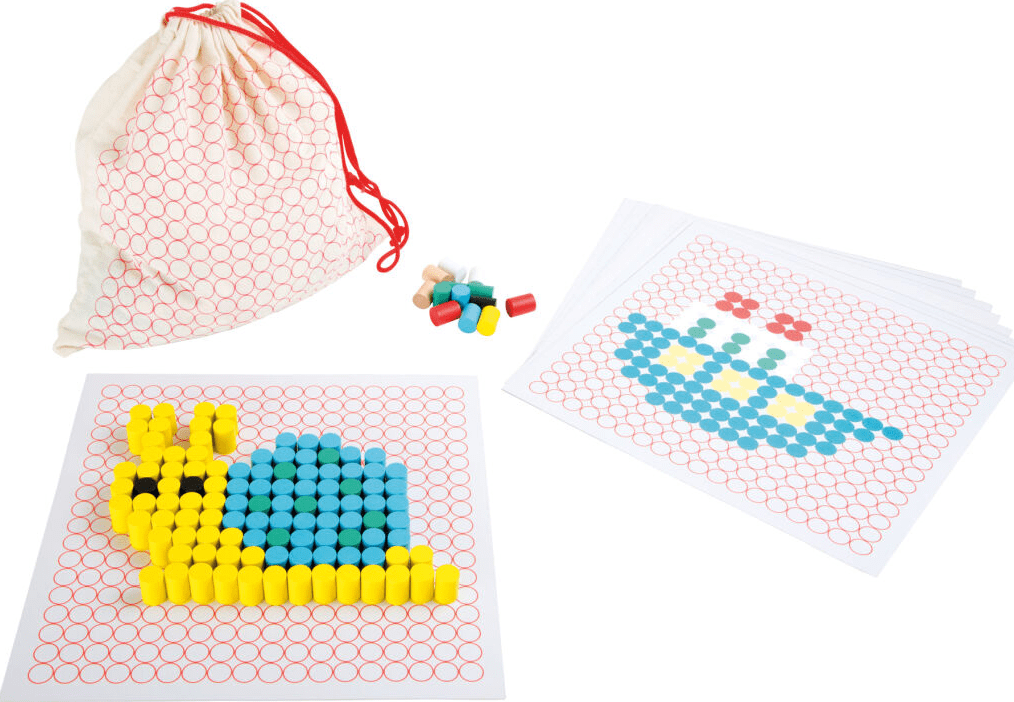 Drevesni zložljivi mozaik v vrečki. Vključuje šablone (9 kosov), na katere položite barvne lesene valjčke in ustvarite čudovite slike. Primerno za otroke od 3. leta starosti dalje.