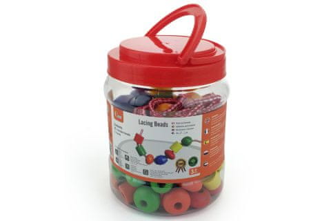 Plastična škatla vsebuje velike lesene kroglice in barvne vezalke, na katere lahko nanizate kroglice. Celoten opis