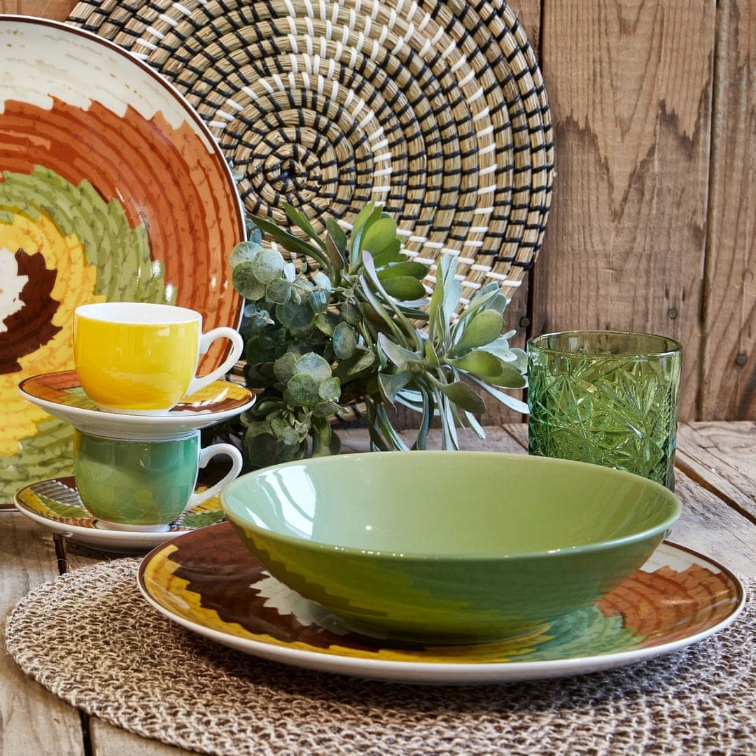 Fade 18-delni set krožnikov Batik je izdelan iz kakovostnega porcelana v zemeljskih barvah in ročno poslikanim vzorcem navdihnjen s slavno proizvodnjo ratana in pisanih okraskov. 18-delno garnituro sestavlja 6 plitvih krožnikov premera 27 cm, 6 globokih krožnikov s premerom 20 cm in višino 4,5 cm in 6 malih krožnikov s premerom 20 cm. Krožniki iz porcelana so primerni za rabo v mikrovalovni pečici in pomivalnem stroju.