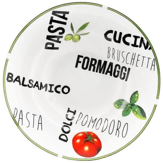 Dekoriran krožnik za testenine s premerom 27 cm. Okrašen je s paradižnikom, baziliko, papriko ter zelenimi olivami in napisi v italijanščini.Krožnik ima na robu značilno zeleno črto, ki se odlično ujema z dekoracijami.Zaradi elegantne izdelave, zaobljenih oblik in pozornosti do podrobnosti je eleganten in izjemen kos opreme ne le za domačo kuhinjo, ampak tudi za gostinske storitve.- Višina: 8,3 cm- Premer: 27 cm- Primeren za pomivanje v pomivalnem stroju