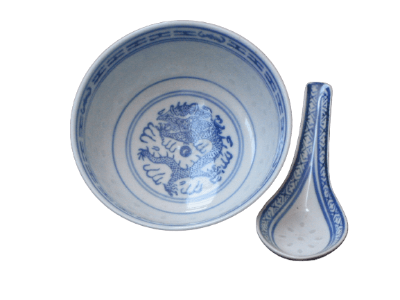 Skodelica z žličko za riž, omako, čaj, kavo z krožničkom , set 1/6, rižev porcelan, dekor zmaj, moder, navaden rob