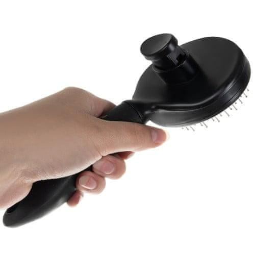 • SAMOČISTILNA  – krtača je samočistilna, zahvaljujoč priročnemu gumbu učinkovito in hitro odstrani dlake z iglic. Je zelo priročna rešitev pri česanju živali, saj vam med krtačenjem ni treba puliti dlake, uporabite le priročen gumb in dlaka se bo dvignila sama.