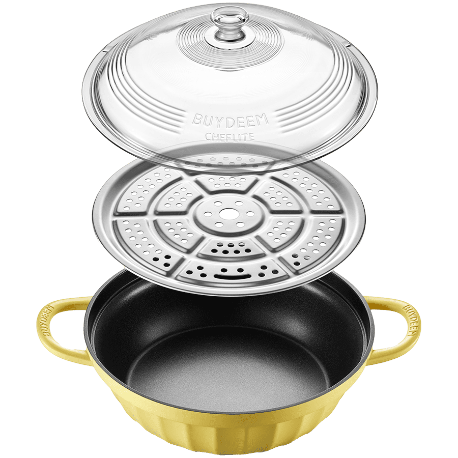 shumee Komplet posode iz emajliranega aluminija s steklenim pokrovom in funkcijo pare BUYDEEM, 3,8 l, model CP181, svetlo rumene barve