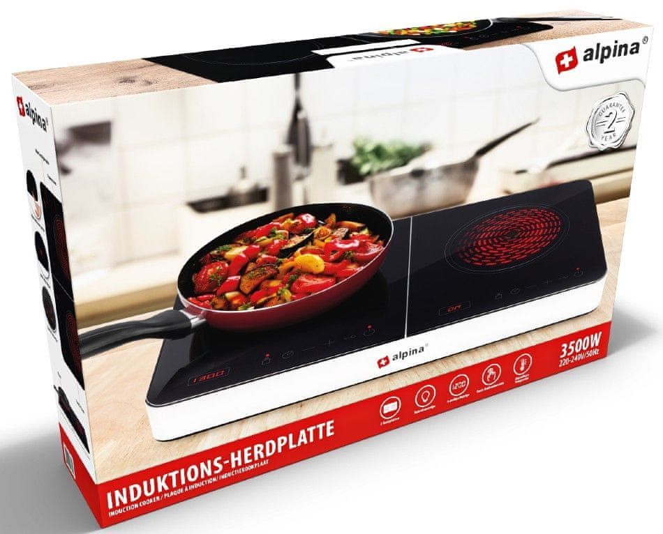 Praktično, če imate majhno hišo, študentsko sobo ali na primer za kampiranje. Na tej indukcijski plošči Alpina z 2 žarnicama lahko pripravite najokusnejše jedi. Enostavno jo priključite v predal in pripravite najokusnejše jedi. Na eni kuhalni plošči lahko pripravite rezance, riž ali testenine, na drugi pa omako, meso in/ali zelenjavo. Na številne prednosti kuhanja z indukcijo se je treba nekoliko navaditi, vendar ima veliko prednosti. Kuhalna območja se segrejejo hitreje kot pri običajnem plinskem štedilniku. Poleg tega se veliko hitreje ohladijo. To pomeni, da je indukcijska kuhalna plošča energetsko učinkovita. Poleg tega je kuhanje na indukcijski plošči zelo varno. Kuhalna plošča ima otroško varnostno ključavnico in zaščito pred pregrevanjem. Ko gorilniki niso v uporabi, se samodejno izklopijo. Še ena velika prednost je, da je kuhalno ploščo enostavno očistiti. Preprosto obrišite z vlažno krpo in končali ste. Od 60 do 240 stopinj Celzija. Temperaturo kuhališč lahko nastavite od 60 do 240 stopinj Celzija. Leva kuhalna cona ima 10 nastavitev, desni gorilnik pa 8 nastavitev. Ta aparat se upravlja na dotik, na 4-mestnem digitalnem zaslonu pa je prikazana stopnja moči, pri kateri trenutno kuhate. Skupna moč indukcijske kuhalne plošče je 3500 W. Od 60 do 240 stopinj Celzija. Temperaturo kuhališč lahko nastavite od 60 do 240 stopinj Celzija. Leva kuhalna cona ima 10 nastavitev, desni gorilnik pa 8 nastavitev. Ta naprava se upravlja na dotik, na 4-mestnem digitalnem zaslonu pa je prikazana stopnja moči, pri kateri trenutno kuhate. Skupna moč indukcijske kuhalne plošče je 3500 W. Opozorilo: Uporabljajte samo posode, ki so primerne za indukcijsko kuhanje. Specifikacije. Desni gorilnik: z 8 nastavitvami. Nastavitev temperature od 60 do 240 stopinj Celzija. Z otroško varnostjo, zaščito pred pregrevanjem in samodejnim izklopom.