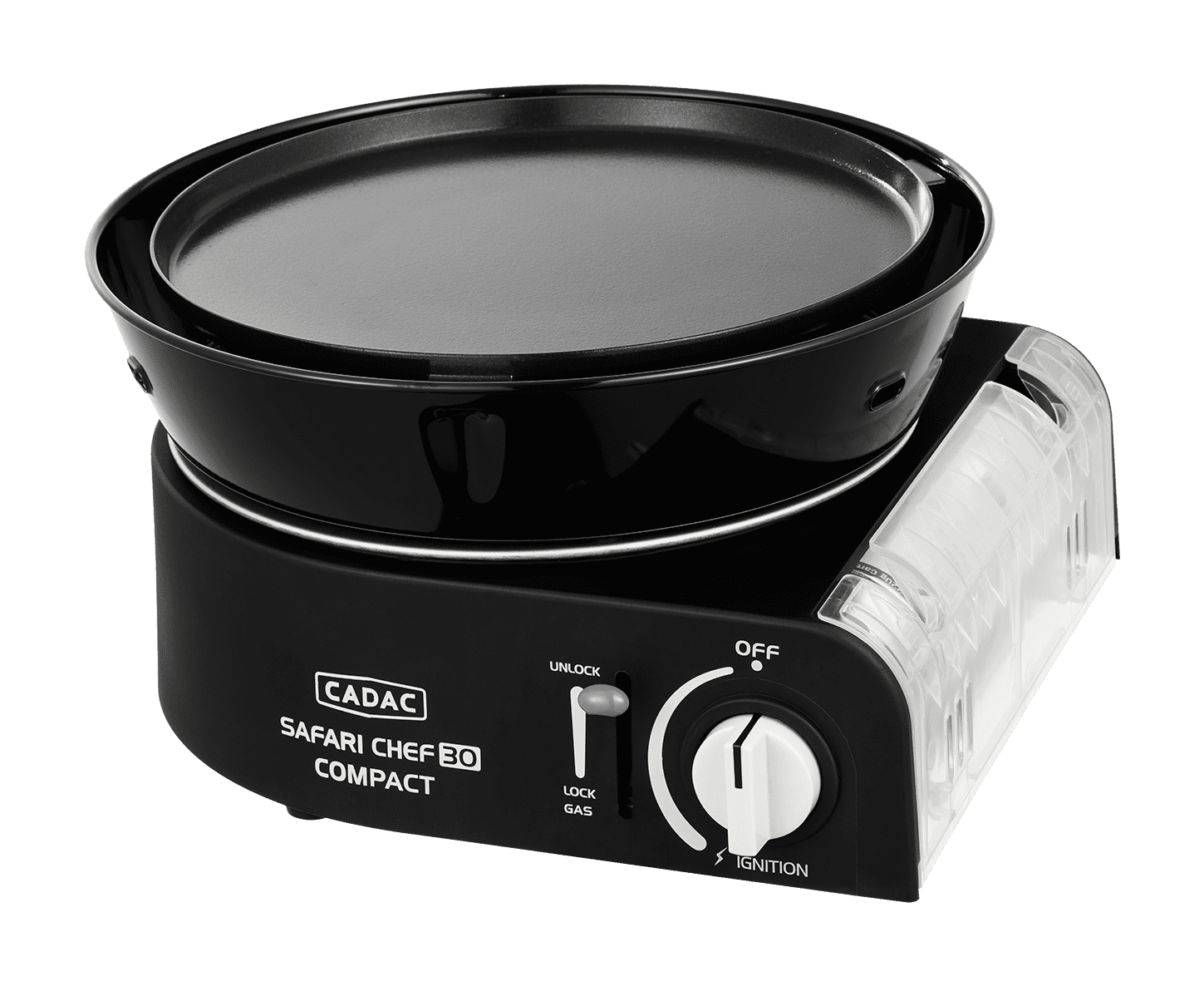 Kljub svoji majhnosti je Safari Chef Compact izjemno vsestranski zaradi različnih priloženih kuhalnih površin; stojalo za lonec, rešetka za žar, ravna plošča in lonec/pokrov. Uporabite stojalo za lonce za kuhanje juhe ali testenin. Mreža za žar in ploščata plošča imata CADAC-ov premaz GreenGrill in sta popolna za peko in pečenje mesa, rib in zelenjave. Pokrov se lahko uporablja tudi kot ponev in je zato večnamenski.