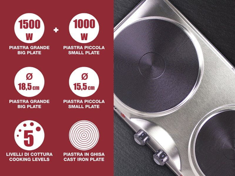 Električni kuhalnik z jeklenim ohišjem in dvema litoželeznima gorilnikoma s premerom 18,5 cm in 15,5 cm. Opremljen z dvojnim termostatom za nastavitev 5 temperaturnih stopenj obeh gorilnikov. Indikatorska lučka delovanja. Zaščita pred pregrevanjem in nedrseče nogice za stabilnost. Idealen za avtodome, počitniške hiše, kampiranje, počitnice ali piknike.