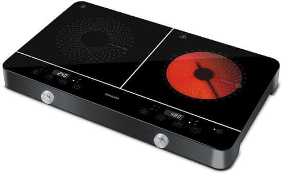Indukcijski in sevalni kuhalnik z dvema ploščama in močjo 1800 W. SENCOR SCP 4001BK ponuja enostavno upravljanje z vrtljivim izbirnikom in ploščo na dotik. Visoka stopnja varnosti zaradi samodejnega zaznavanja posode.  Celoten opis