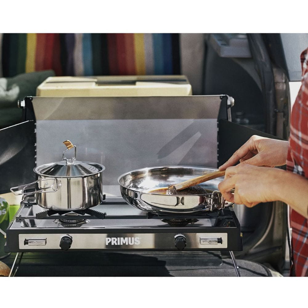 Trpežen kuhalni set iz nerjavečega jekla (18/8), ki vsebuje dve posodi (1,0 in 1,8 L), dva pokrova z vgrajenim priročnim cedilom in ponev. Ponev ima vgrajen ročaj, ki je zložljiv. Premaz iz aluminija zagotavlja enakomerno porazdelitev toplote. Priložene so vrečke za shranjevanje. S kuhalnim setom boste lahko med kampiranjem ali na potovanju ustvarjali kulinarične mojstrovine.