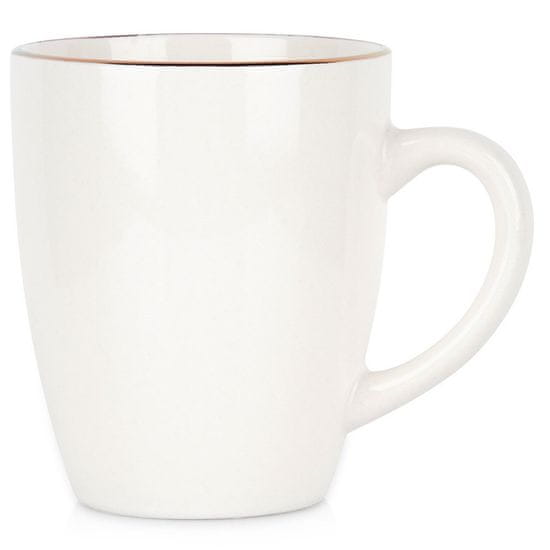 Bela skodelica z zlato dekoracijo za pitje kave, čaja in drugih pijač. Preprosta in klasična oblika naredi skodelico zelo udobno za uporabo. Popolna za domačo uporabo. Dobro se poda k vsakemu jedilnemu priboru. Izdelano po evropskih standardih.