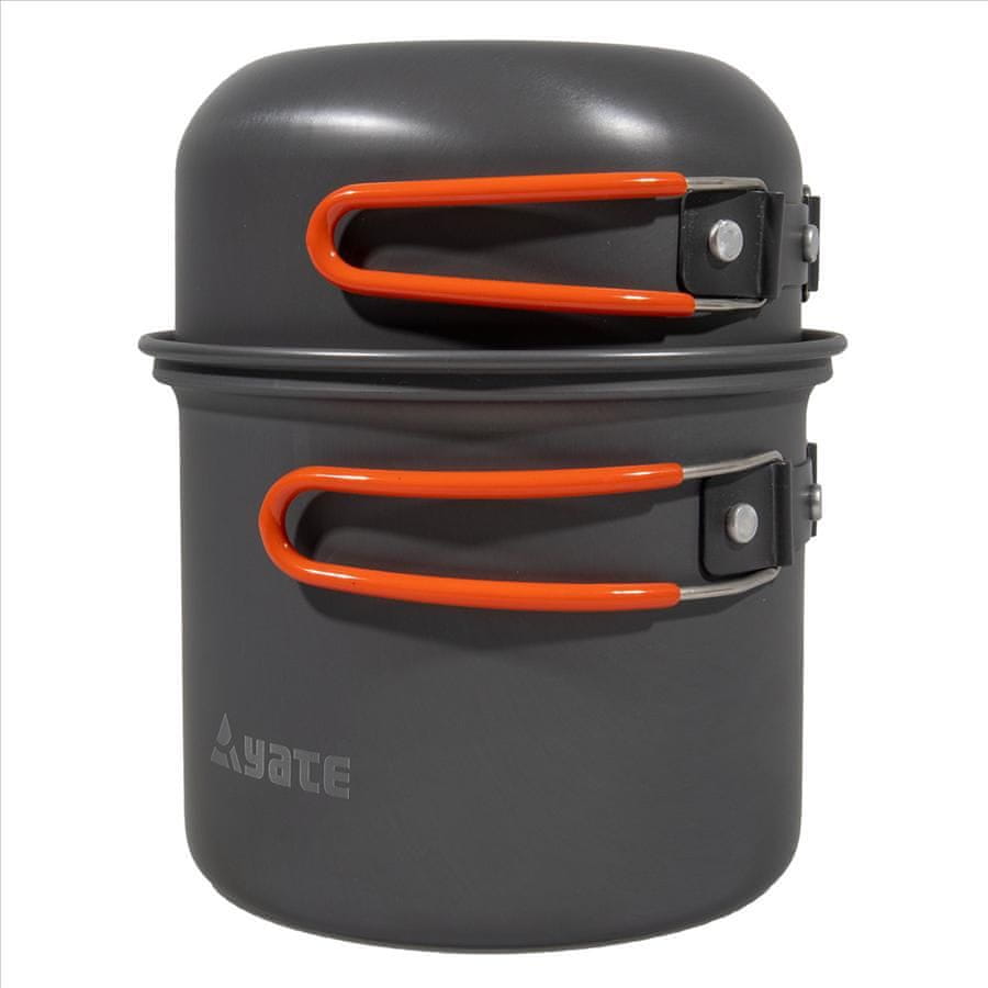 Posoda za kuhanje za 1 – 2 osebe je narejena iz trdega eloksiranega aluminija in teflonskim nanosom. Kuhinjska posoda ima površino, odporno proti obrabi. Pri kuhanju uporabite samo nekovinska orodja, da ne bi opraskali površine. Ročaji so izdelani iz plastike za zaščito pred toploto. Torbica za transport.