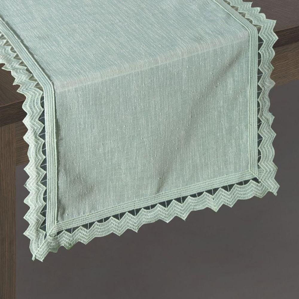 Ekskluzivni namizni prt iz kolekcije Premium, izdelan iz tkanine s strukturo lanu, ki je na robovih zaključena s klasično čipko. Enostaven za likanje, univerzalni klasični chatakter širina: 35 cm, dolžina: 140 cm, barva: meta, teža: 200 GSM, sestava: 100 % poliester