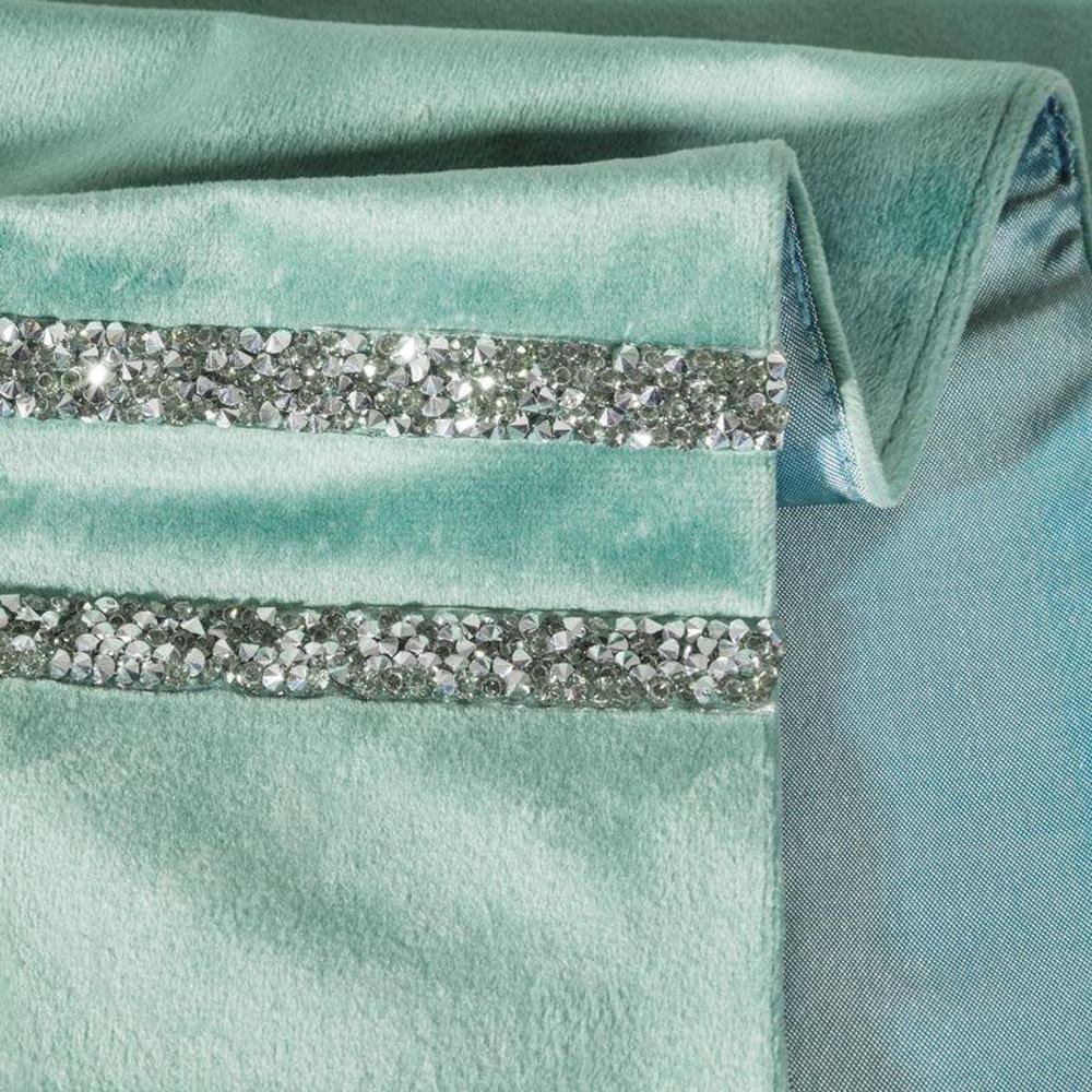Eleganten tekač iz mehke in na otip prijetne žametne tkanine, okrašen z dvema trakovoma privlačne galanterije z drobnimi cirkoni. Širina: 35 cm, dolžina: 180 cm, barva: meta, teža: 260 GSM, sestava: 100 % poliester