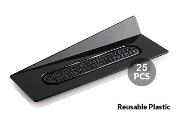 Elegantni plastični pladnji za večkratno uporabo, idealni za razstavljanje, shranjevanje in prenašanje posameznih porcij zaradi inovativnega nedrsečega osrednjega dela in praktične stranske lopute.