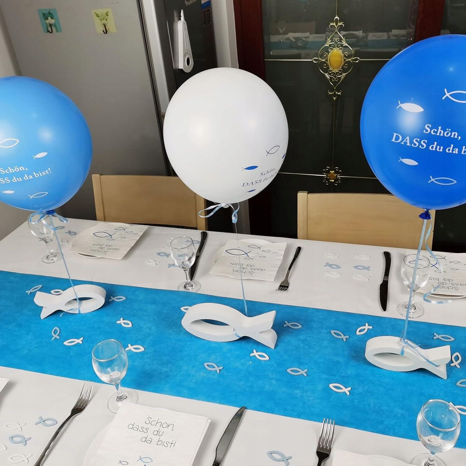 Ta komplet za dekoracijo z ribicami je odličen za različne priložnosti, kot so krst, prvo obhajilo, birma ali druga praznovanja. Motiv ribe ni le starodavni krščanski simbol, temveč tudi zodiakalno znamenje in predstavlja srečo in obilje. Komplet je sestavljen iz prtičkov, balonov in lesenih ribic ter ustvarja harmonično in očarljivo dekoracijo mize.