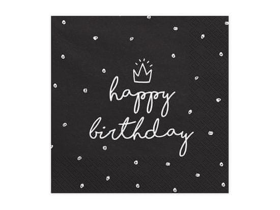 Troslojni prtički Happy Birthday, črni z belim potiskom, dimenzije 33 × 33 cm.